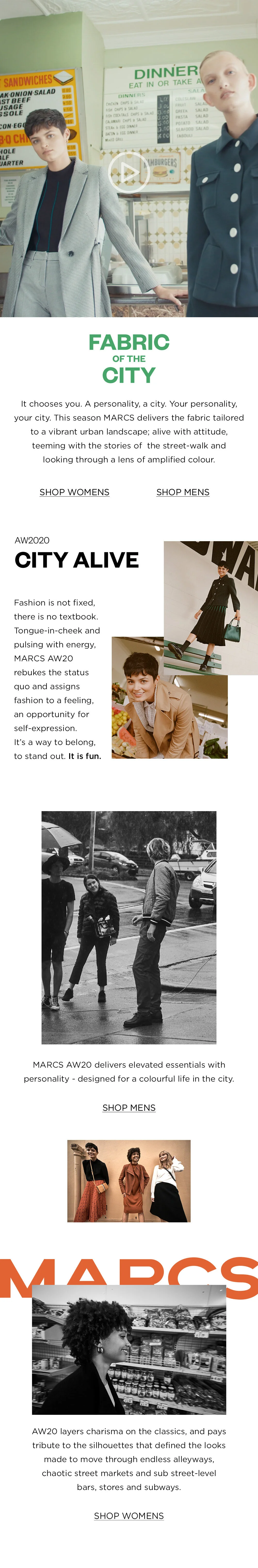 Seasonal overview of Marcs 2020 Campaign. Supported with EDM, Marketing & Sale Copy. Provided EDM copy for Marcs SS19 and Resort 19 seasons prior to this.